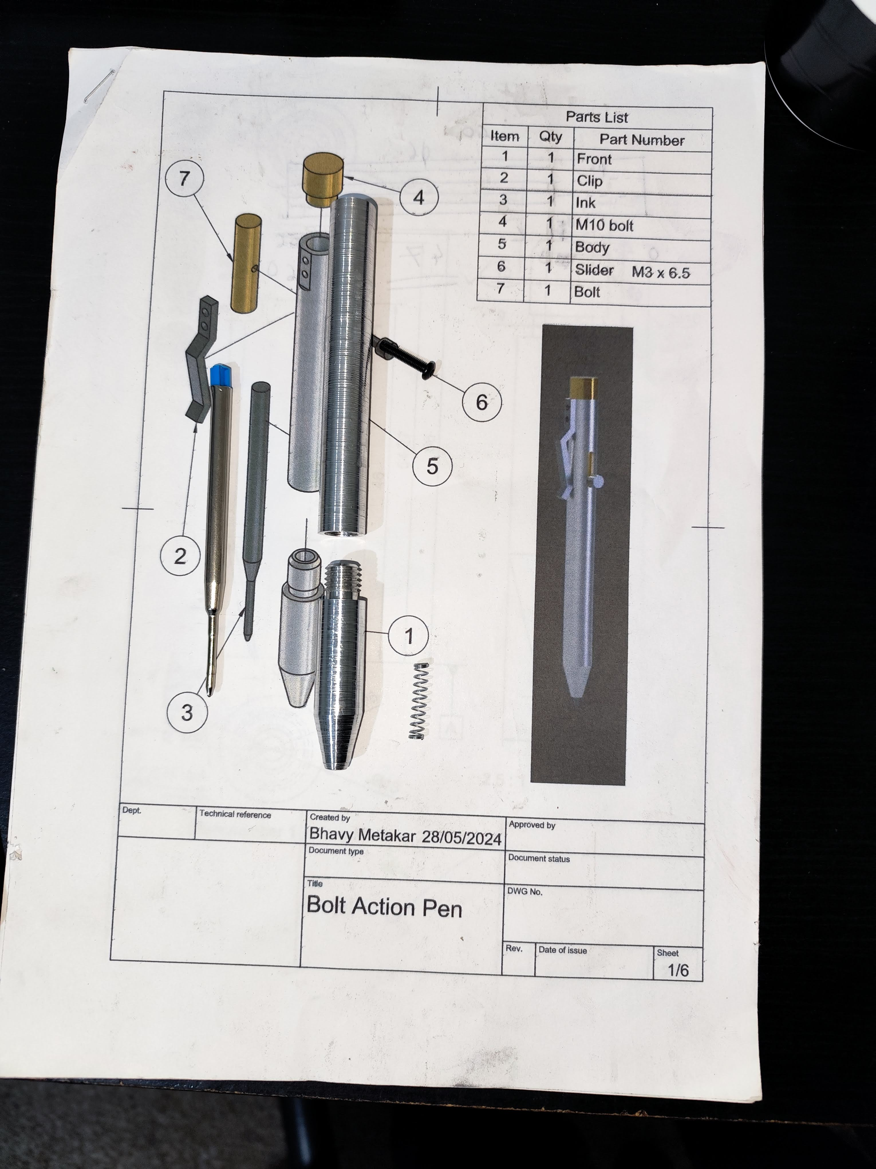 Having been inspired by a precision machinist on YouTube, I decided to design and make my own bolt action pen. I designed it in parametric CAD and created Engineering drawings of it, in guidance with ISO standards. The project is still in progress, but using the drawings I started machining each part, thinking about the order of operations as well as the necessary procedures and tooling.