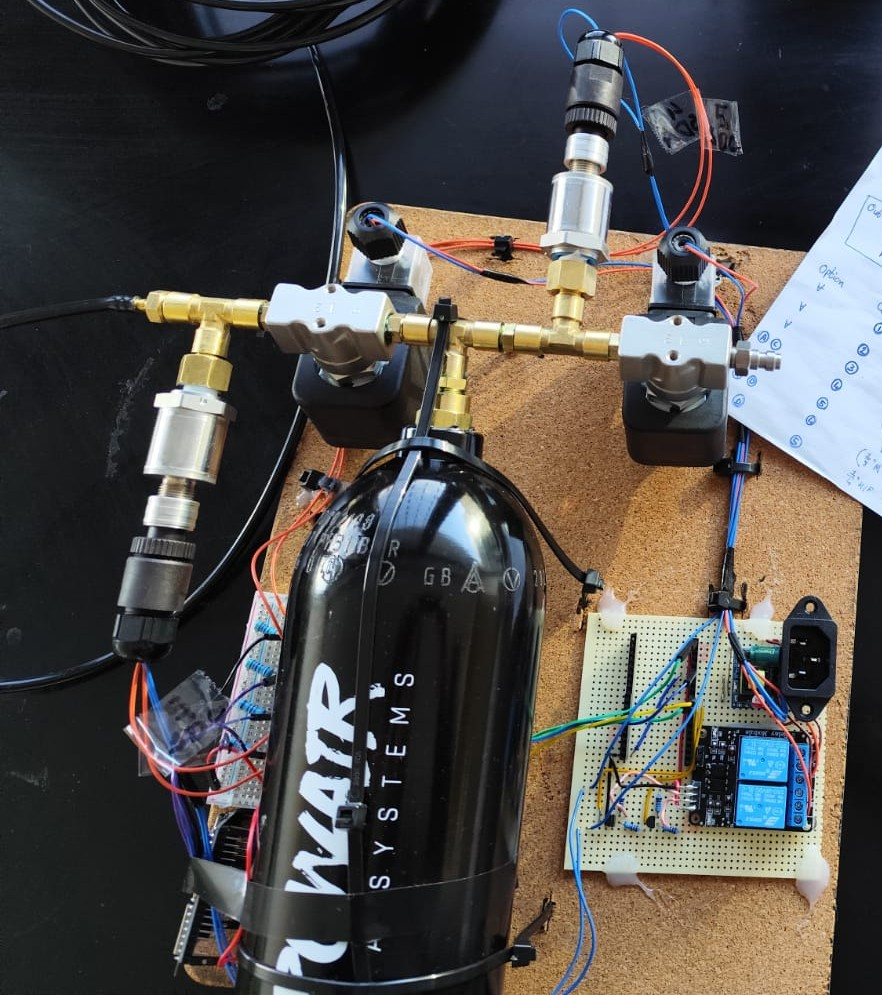 Prototyped an high pressure control and storage system that could be controlled over the internet. This deviced was used to test the knee braces developed at Hippos Exoskeleton. The purpose of making this was that commercial air compressors did not offer such wireless control and were not rated for the desired pressures. It could safely store high pressure gas and release it for specified time periods (in the order of magnitude of milliseconds) and it could be controlled over the internet using an ESP32-based web server.